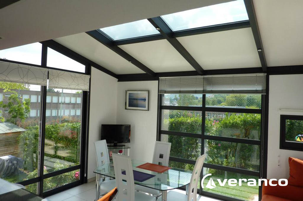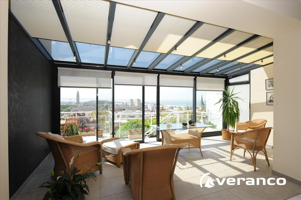 - La toiture est à rupture intégrale de pont thermique et se ferme de différentes manières (double/triple vitrage avec protection solaire "heat mirror", panneaux isolants polycarbonate ou opaque), notre exclusivité le Panneau Isolant Liège lui confère une isolation thermique et phonique incomparable